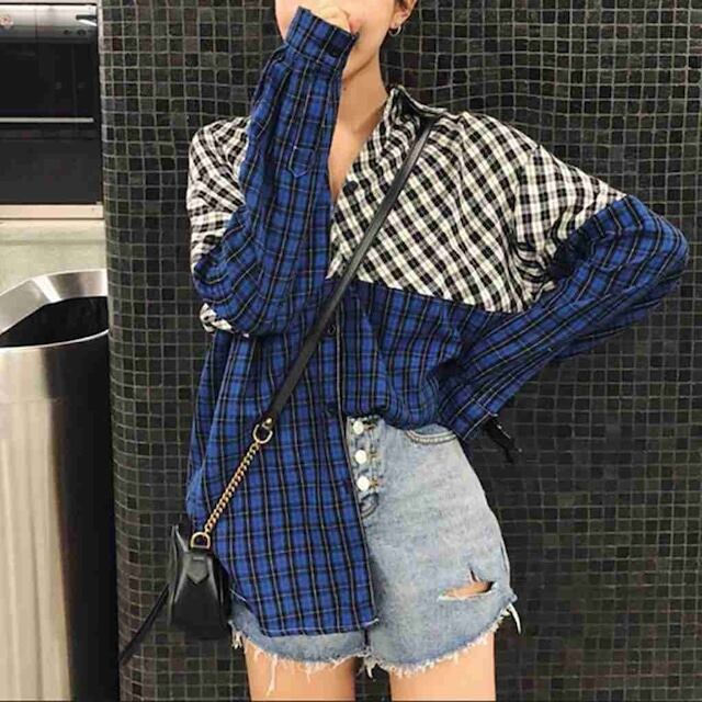 二種類のチェック柄がドッキングされた個性的な長袖シャツ。
