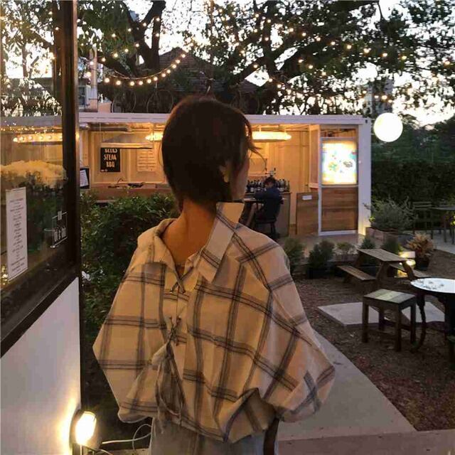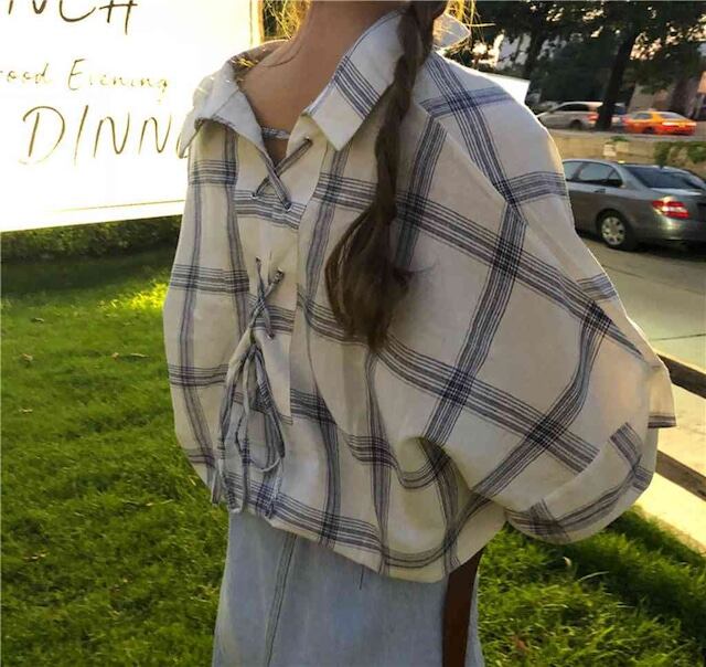 ガーリーだけど柔らかな配色で落ち着いたバックリボンチェックシャツ。